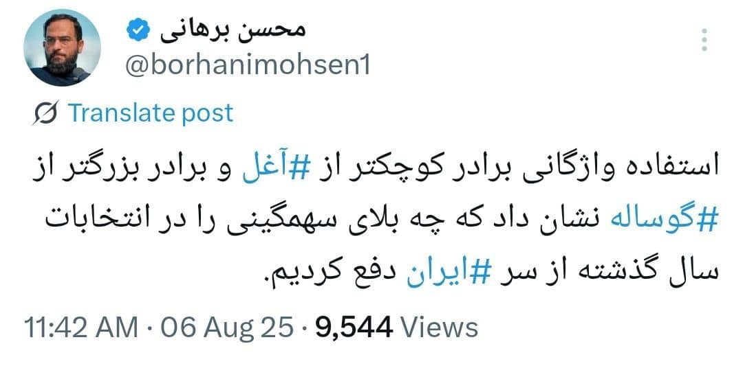 کد خبر : 7622 تاریخ انتشار : 1404/05/15 نسخه چاپی : اندازه فونت : واکنش برهانی به اظهارات اخیر سعیدجلیلی و برادرش واکنش محسن برهانی به اظهارات جلیلی: مشخص شد چه بلایی از سر ایران دفع شد
